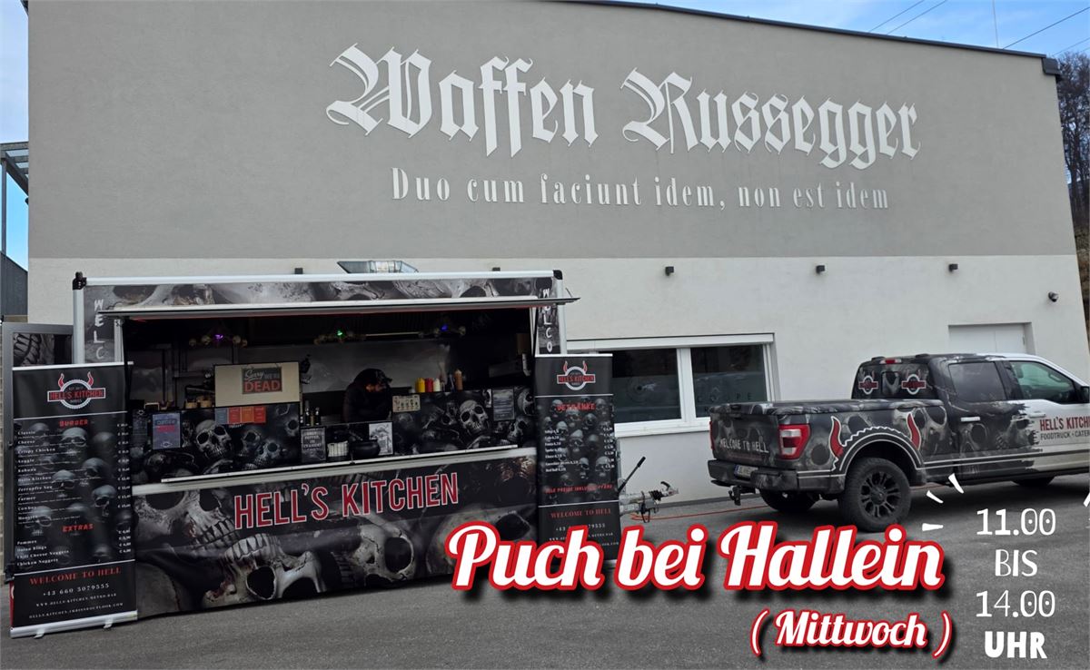 Hell`s Kitchen - das ist Streetfood mit „höllisch gutem“ Geschmack! Jeden Mittwochmittag verwandelt sich der Platz bei Waffen Russegger in Puch/Urstein in ein Mekka für Burger-Fans. Die hochwertigen Burger mit frischen Zutaten und tollen Veggie-Alternativen wurden bereits vier Jahre in Folge von Falstaff ausgezeichnet. Wer ein Event plant, kann das Team von Hell’s Kitchen auch für ein Catering anfragen.