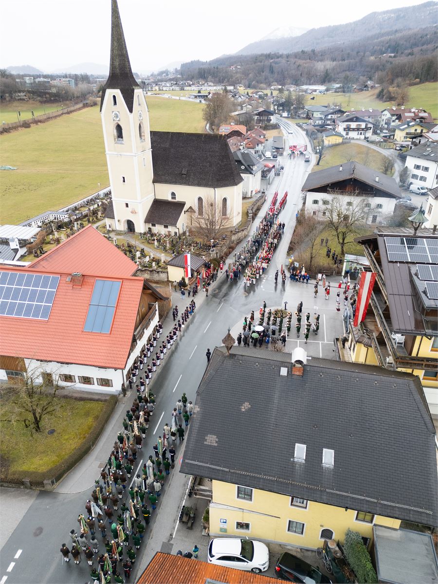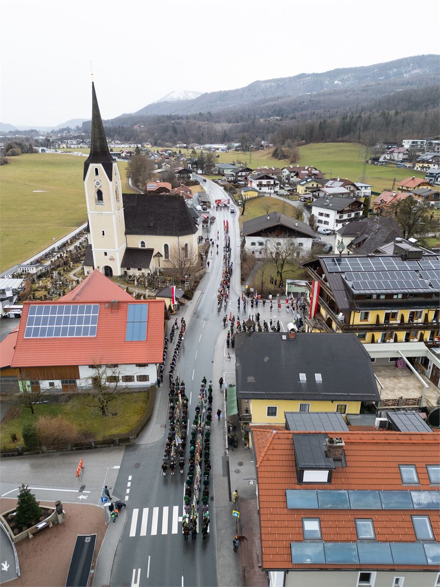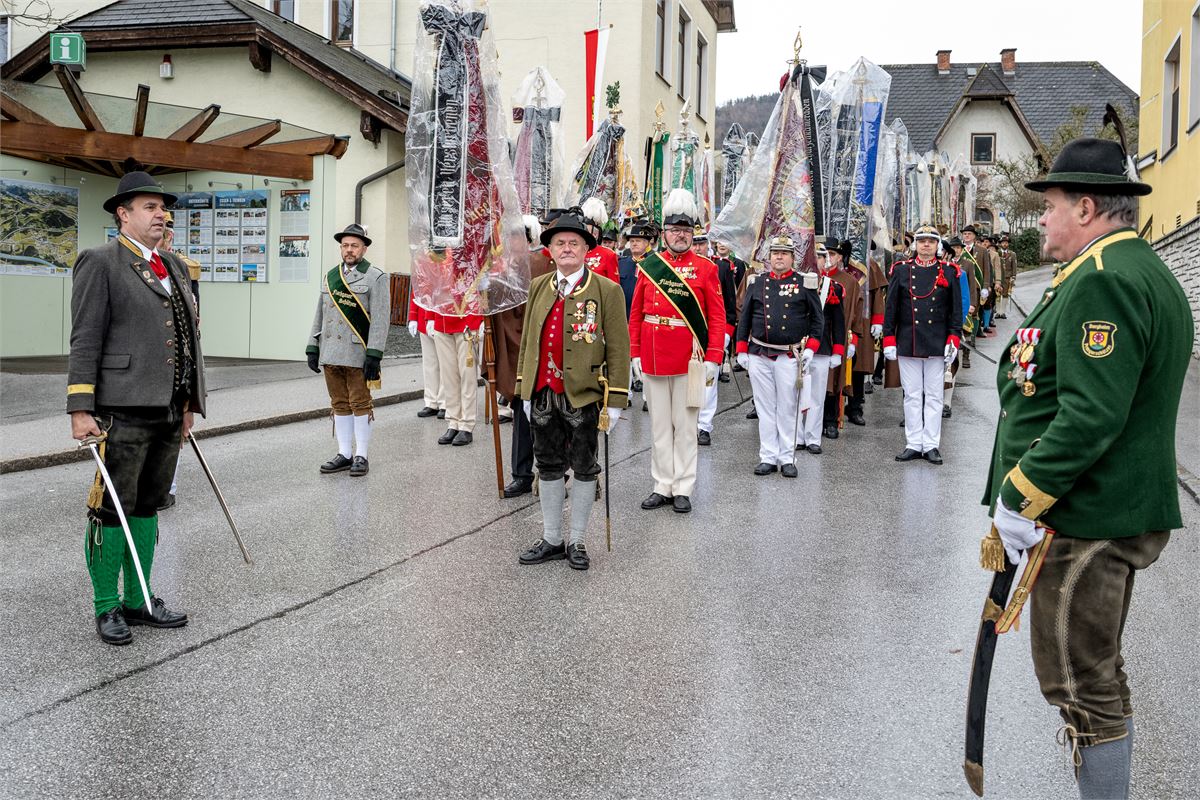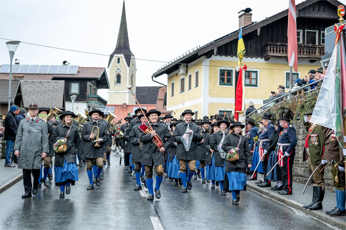 Nach dem Gottesdienst verlagerte sich das Geschehen auf den Parkplatz hinter dem Gemeindeamt, wo der offizielle Festakt in einem feierlichen Rahmen stattfand. Der Auszug über die große Stiege auf der Rückseite der Kirche bot ein einmaliges Bild von wehenden Fahnen sowie bunten Uniformen und Trachten.